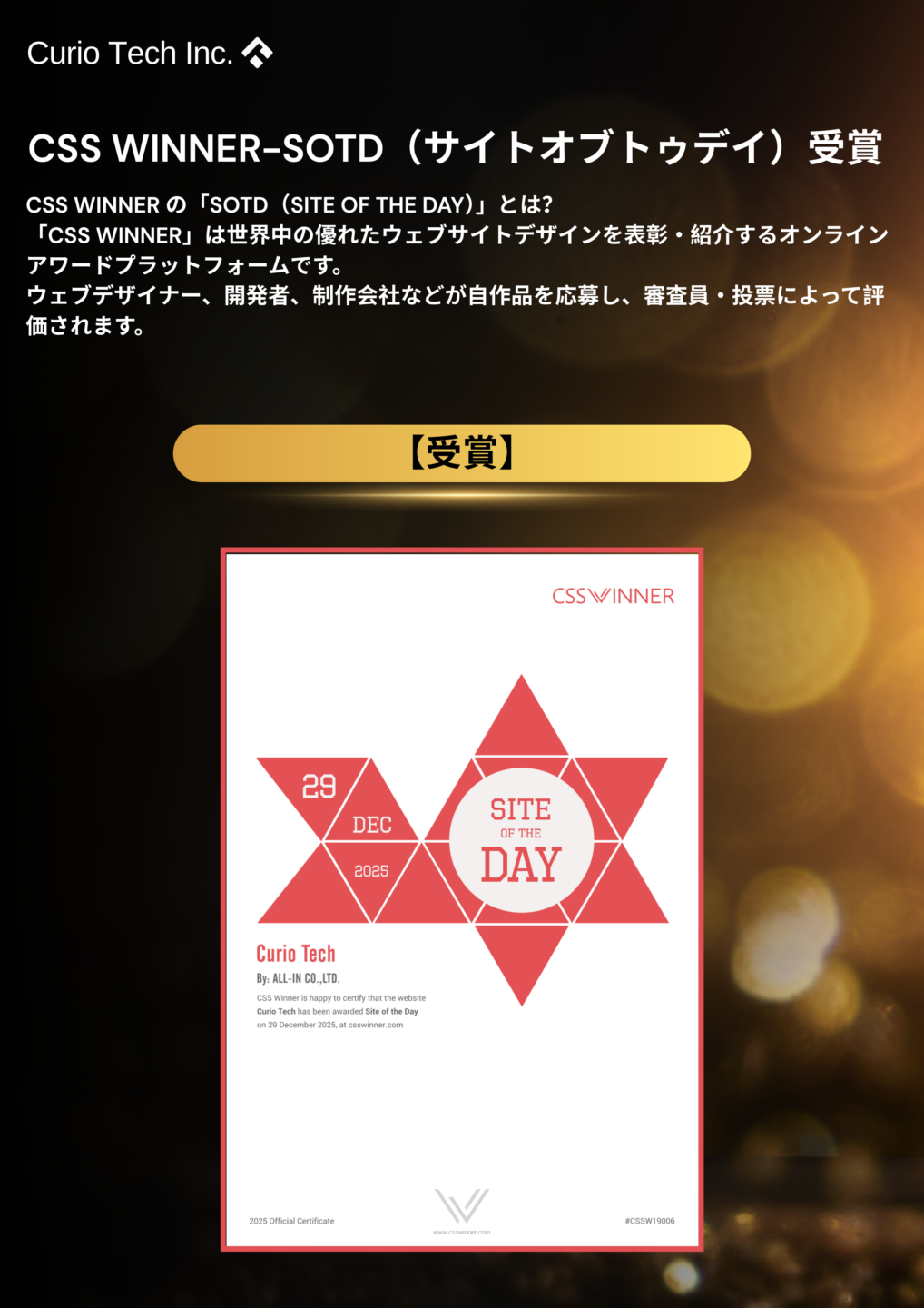 このたび、株式会社CurioTechのコーポレートサイトが、国際的なWebデザインアワードを受賞いたしました。